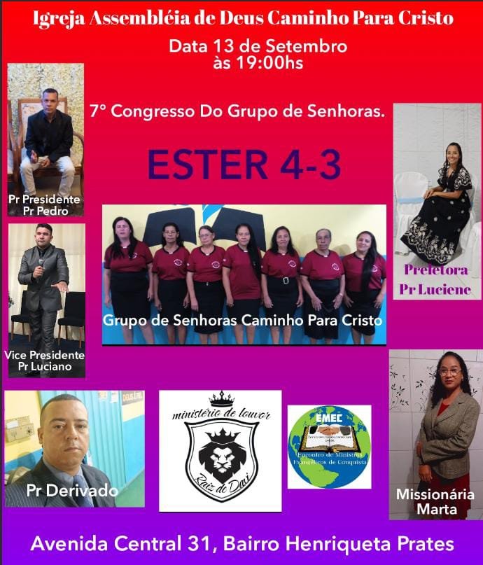 7o. Congresso de Senhoras da Igreja Assembléia de Deus Caminho para Cristo no dia 13 de setembro de 2025, às 19:00 horas. Endereço: Av. Central,