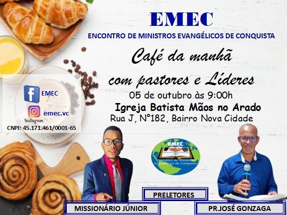 Reunião da EMEC-Encontro de Ministros Evangélicos de Conquista, no dia 05 de outubro às 09:00 horas, com Café da Manhã, na Igreja Batista Mãos no