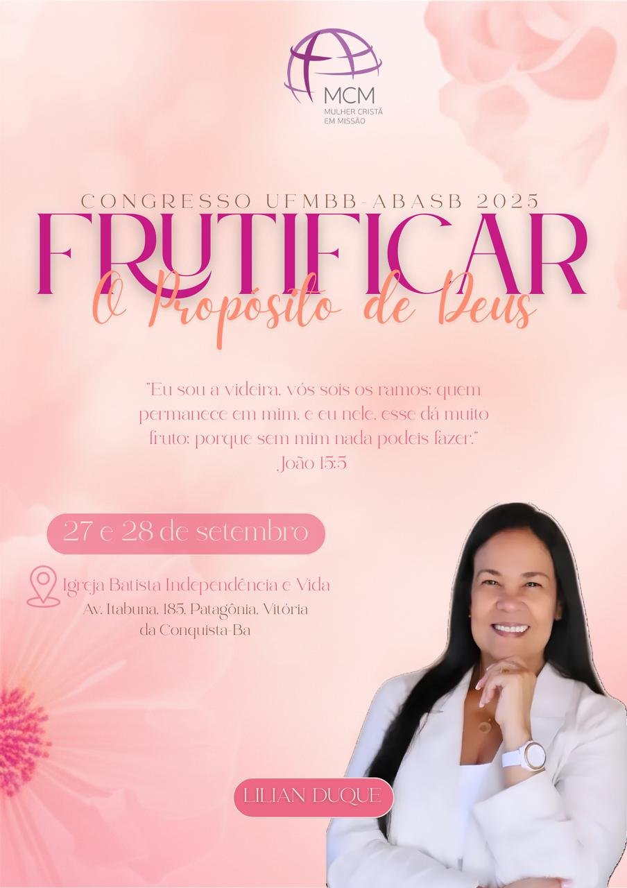 Congresso Frutificar da UFMBB ABASB 2025, nos dias 27 e 28 de setembro às 19:30 horas, na Igreja Batista Independência e Vida que fica na