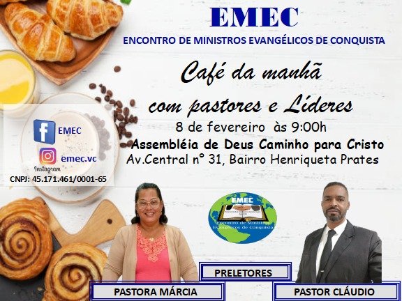 Reunião da EMEC-Encontro de Ministros Evangélicos de Vitória da Conquista, dia 08 de fevereiro de 2026, com Café da Manhã, às 09:00