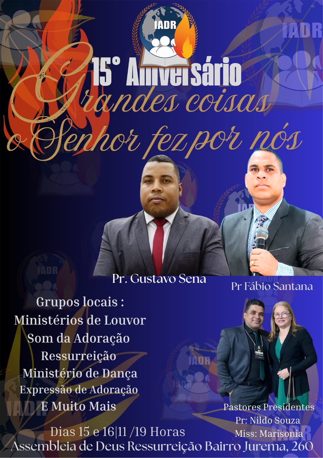 15o. aniversário da Igreja Assembléia de Deus Ressureição nos dias 15 e 16 de novembro de 2025, às 19:00 horas. Preletores: Pr