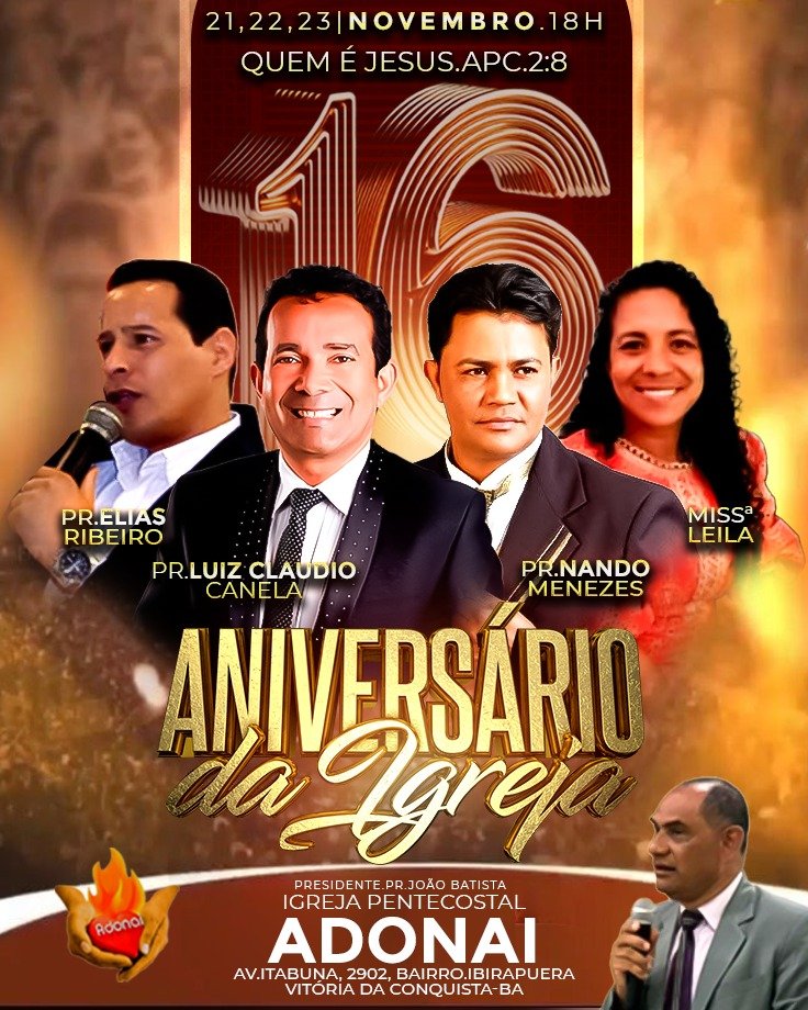 16o. aniversário da Igreja Pentecostal Adonai nos dias 21, 22 e 23 de novembro de 2025, às 18:00 horas. Tema: Quem é