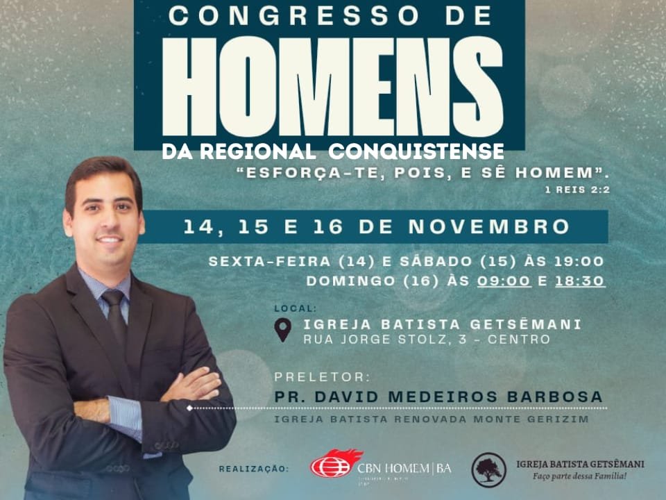 Congresso de Homens da Regional Conquistense da CBN nos dias 14, 15 e 16 de novembro de 2025, às 19:00 horas, exceto