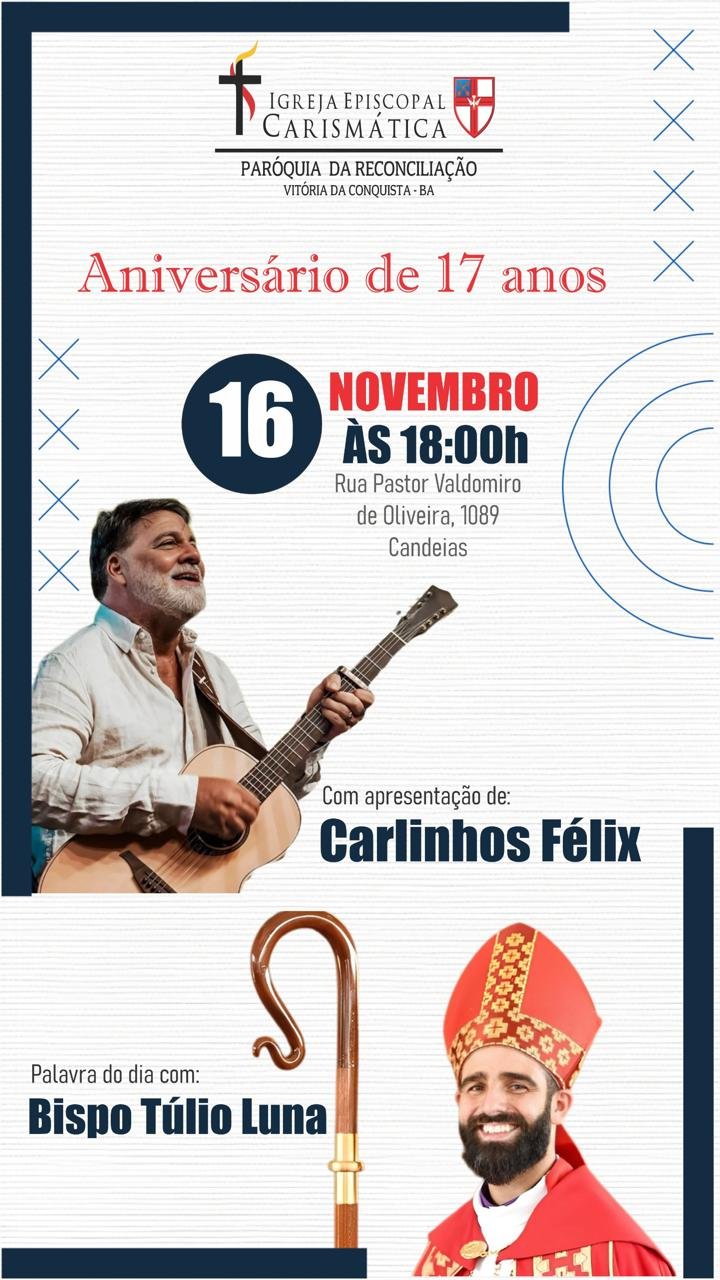 Aniversário de 17 anos da Igreja Episcopal Carismática, no dia 16 de novembro de 2025, às 18:00 horas. Preletor: Bispo Túlio Lima.