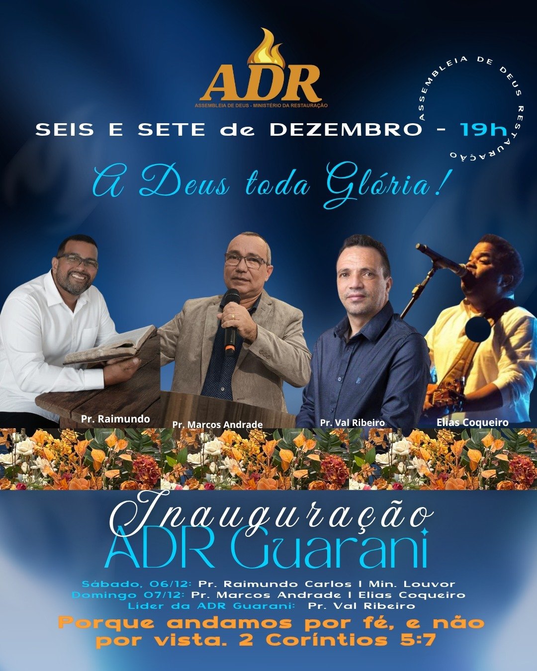 Dias 6 e 7 de dezembro de 2025, às 19:00 horas, Inauguração da Assembléia de Deus Restauração no Bairro Guarani. Preletores: Pr